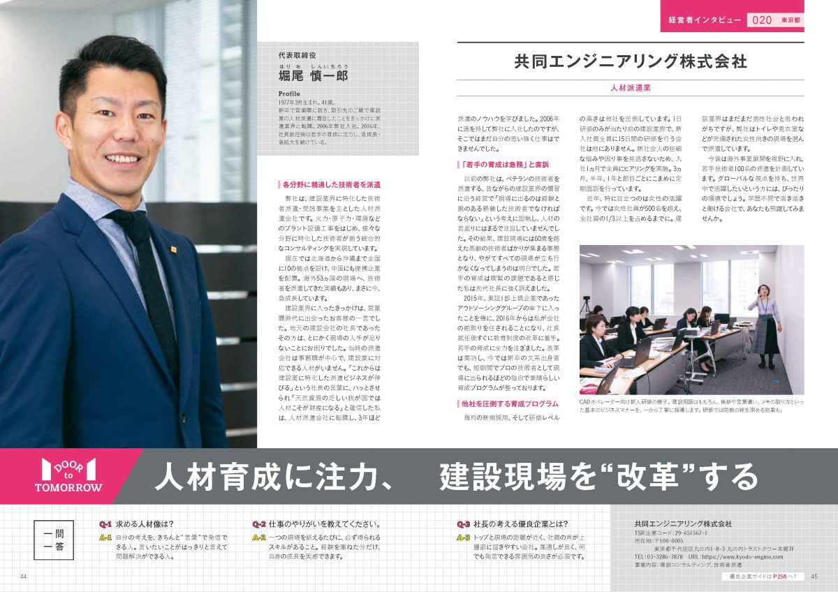 共同エンジニアリング株式会社は、「建設業就労者は高齢者の比率が全業種と比して高く、現状の人手不足に加え、将来的な人手不足に対する警戒感が強まっているが、同社の未経験者を教育して配属するスキームが取引先に高く評価され、近年の売上は大幅に伸長している。教育研修・フォローアップ研修等のサポート体制は充実しており、社員の定着率は高く、更なる成長が期待される。」と評価されています。