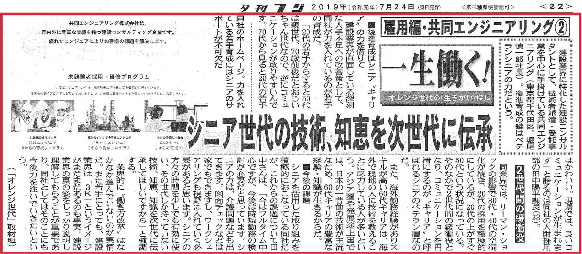 夕刊フジ 2019年7月24日(23日発行) 「シニア世代の技術、知恵を次世代に伝承! 2世代間の緩衝役」(無断転載・複写不可)
