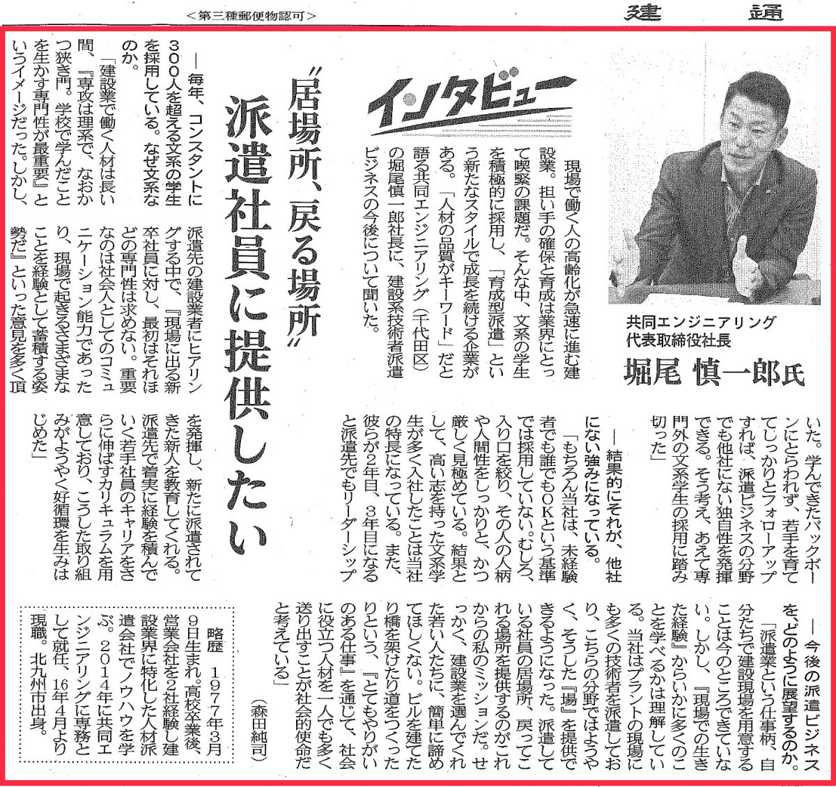 建通新聞東京版 2019年9月10日付掲載 「居場所 戻る場所 派遣社員に提供したい」