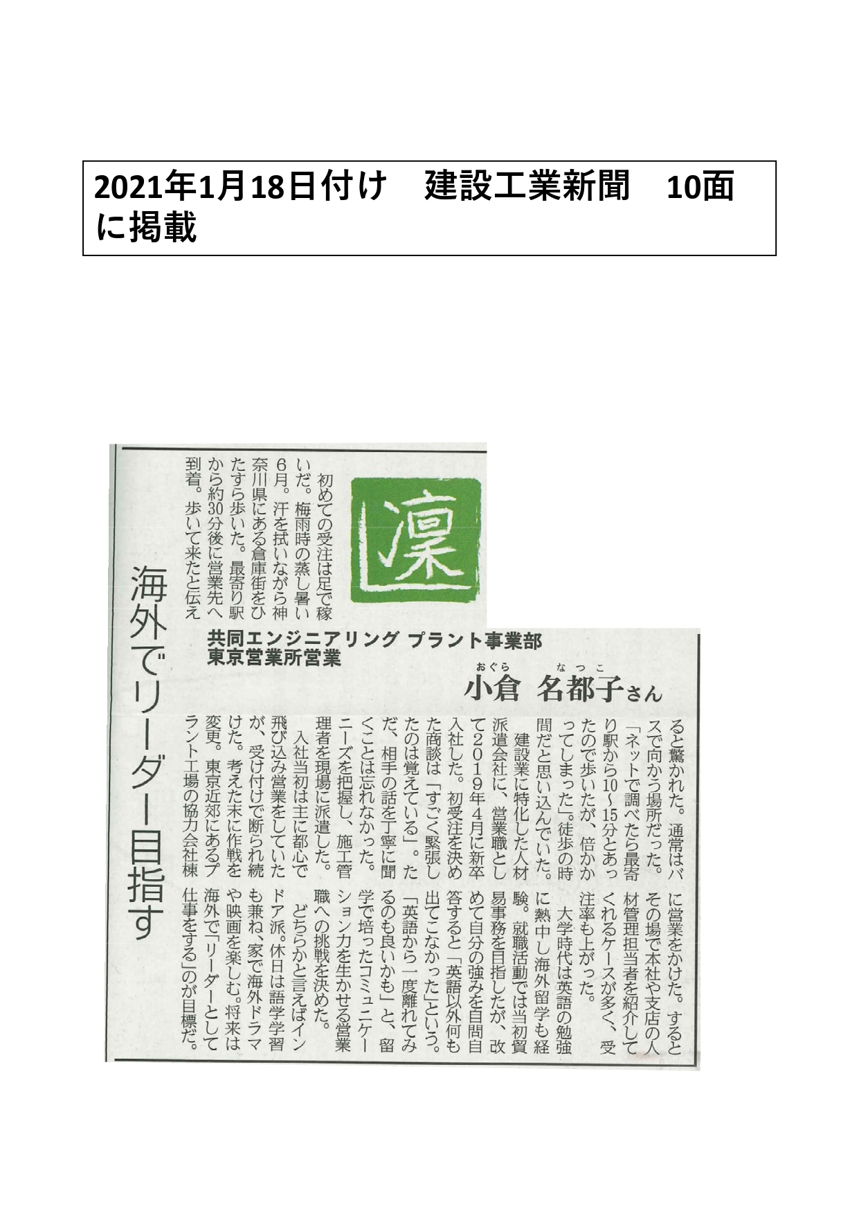 2021年1月18日発行の建設工業新聞(日刊建設工業新聞社)に、弊社プラント事業部営業 小倉社員のインタビュー記事が掲載されました。