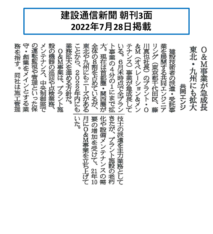 この度、当社O&M事業部の取り組みが、7月28日付けの建設通信新聞にて掲載されましたので、お知らせいたします。