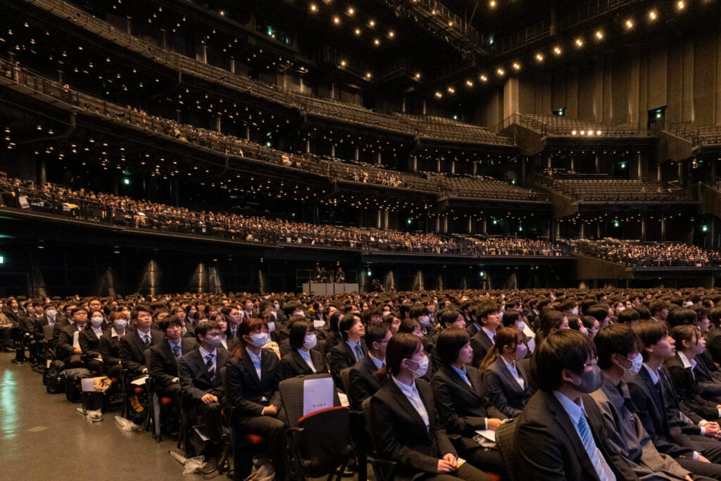 入社式は前年度に引き続き、当社を始めとしたアウトソーシンググループ全体による合同入社式が行われ、約2,600名の新入社員が列席いたしました。